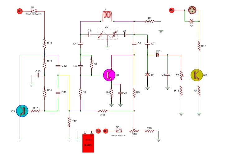 transistor Q4, ‘L’ and C1, CV, C3 combination.